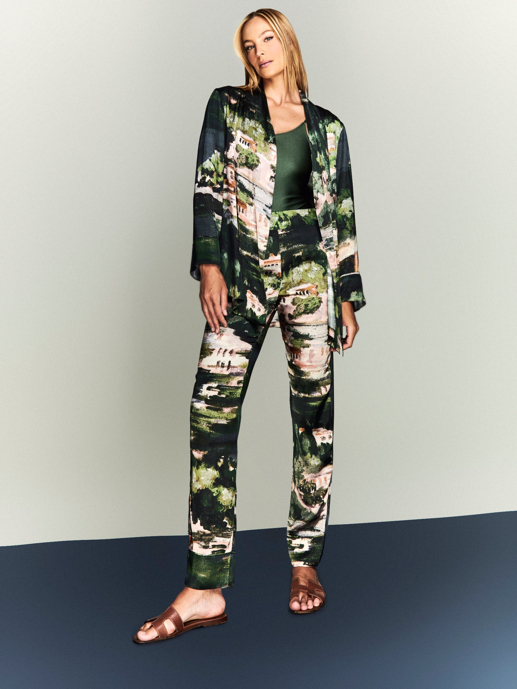 CONJUNTO DE KIMONO COM FAIXA PARA AMARRAÇÃO E CALÇA RETA COM BOLSOS FACA E TRASEIROS.