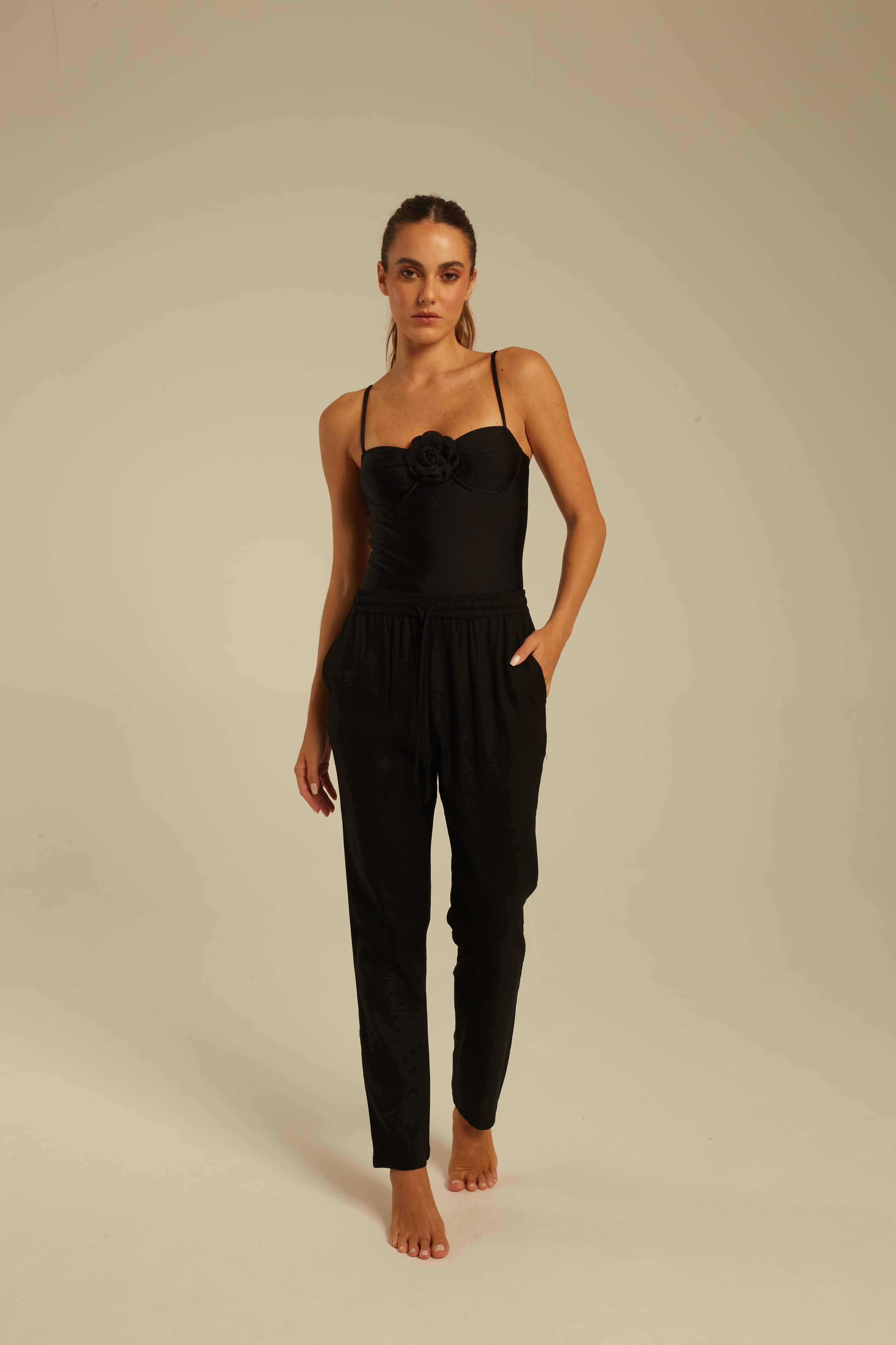CALÇA COM BOLSO FACA E CÓS COM ROLOTÊ PARA AMARRAR.