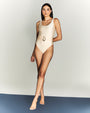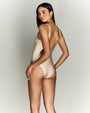 BODY COM ALÇA, DECOTE PROFUNDO E CINTO FIXO COM FIVELA ORGÂNICA.