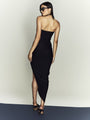 Vestido tomara que caia com drapeado lateral e fenda assimétrica