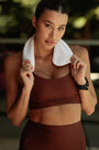 Top em tecido levemente brilhante, com alças ajustáveis e reforçadas, oferecendo sustentação ideal para treinos de alta intensidade. O acabamento canelado confere um toque moderno e sofisticado.