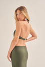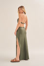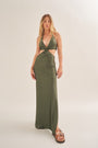 VESTIDO LONGO COM DECOTE EM V E RECORTES LATERAIS. DETALHE COM NÓ CENTRAL.