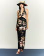 VESTIDO LONGO COM DECOTE EM V E RECORTES LATERAIS. DETALHE COM NÓ CENTRAL.