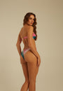 Bikini tomara que caia com calcinha cavada fixa e top entrelaçado na estampa degradê azul e rosa