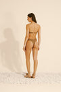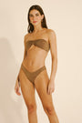 Conjunto de bikini com calcinha cavada, top faixa com franzido frontal e detalhe de alça de corrente.