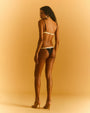 Conjunto de bikini triangular bicolor preto e branco, com alças e calcinha ajustáveis