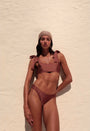 Bikini top com laços removíveis, calcinha cavada em preto e branco.