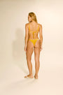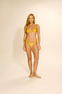 Biquini lycra brilho em um tom de amarelo, o modelo possui textura suave ao toque e toque de elasticidade, garantindo ajuste perfeito ao corpo. O top é no modelo cortininha com bojo removível com as alças finas e ajustáveis, com amarração no pescoço e nas costas, permitindo versatilidade e conforto durante o uso.
