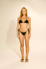 A calcinha tem modelagem estilo tanga com laterais de amarração ajustáveis, o que permite adaptar a peça ao seu corpo. O recorte empina bumbum valoriza as curvas com naturalidade.
