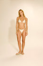 Biquini lycra brilho em na cor off white, o modelo possui textura suave ao toque e toque de elasticidade, garantindo ajuste perfeito ao corpo. O top é no modelo cortininha com bojo removível com as alças finas e ajustáveis, com amarração no pescoço e nas costas, permitindo versatilidade e conforto durante o uso.