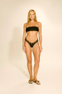 Biquíni estilo faixa com uma modelagem que valoriza o corpo de forma moderna e elegante. Confeccionado em tecido lycra brilho, o conjunto tem um acabamento sofisticado e ao mesmo tempo fun, graças ao detalhe principal: o bordado manual com miçangas coloridas aplicadas em toda a borda da parte de cima e da calcinha.