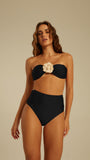 Bikini tomara que caia com detalhe de flor e calcinha hot pant