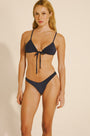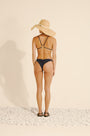 Biquíni com um anel dourado nas costas e partes de baixo com amarrações laterais e cordões