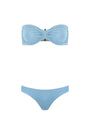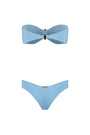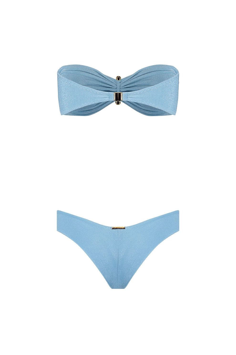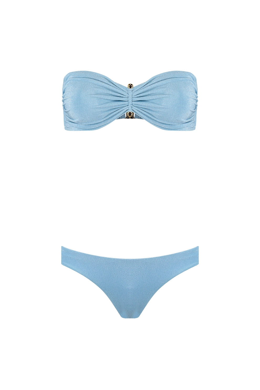 Biquíni modelo tomara que caia estruturado e recorte drapeado no centro, finalizado com um travete dourado.