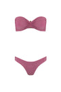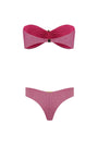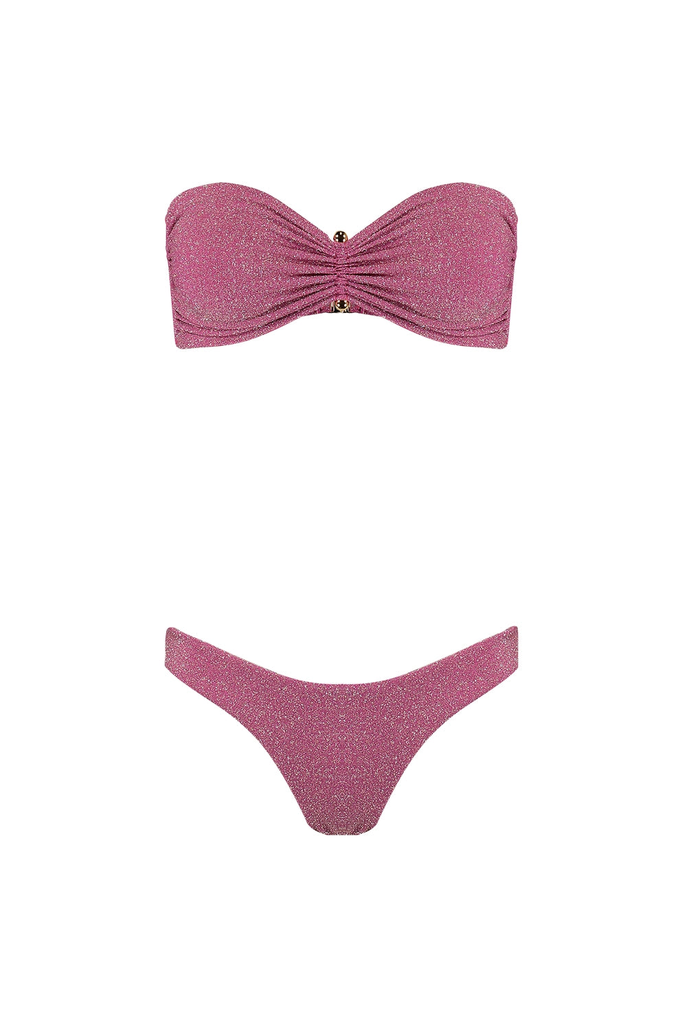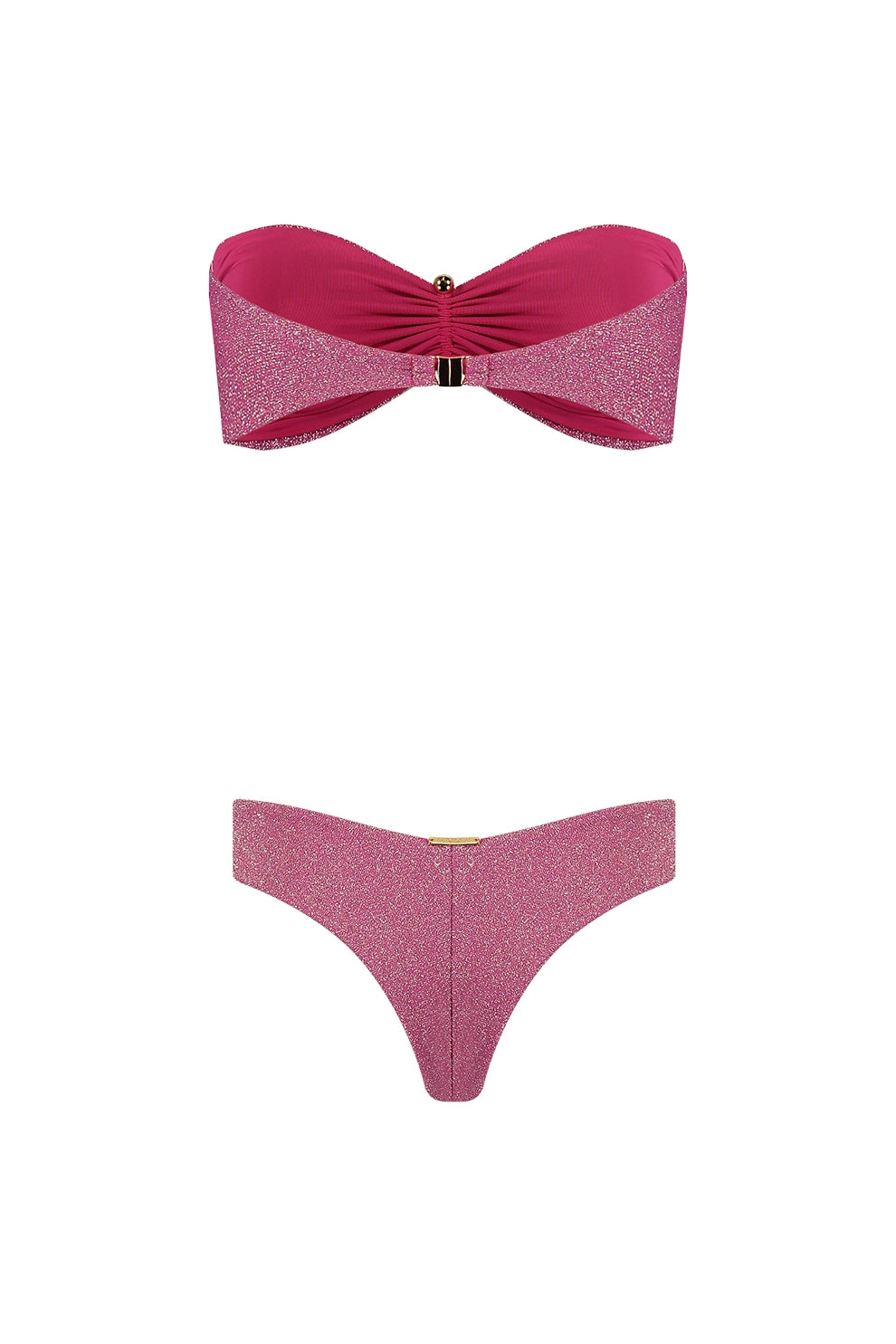 Biquíni modelo tomara que caia estruturado e recorte drapeado no centro, finalizado com um travete dourado.