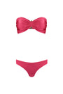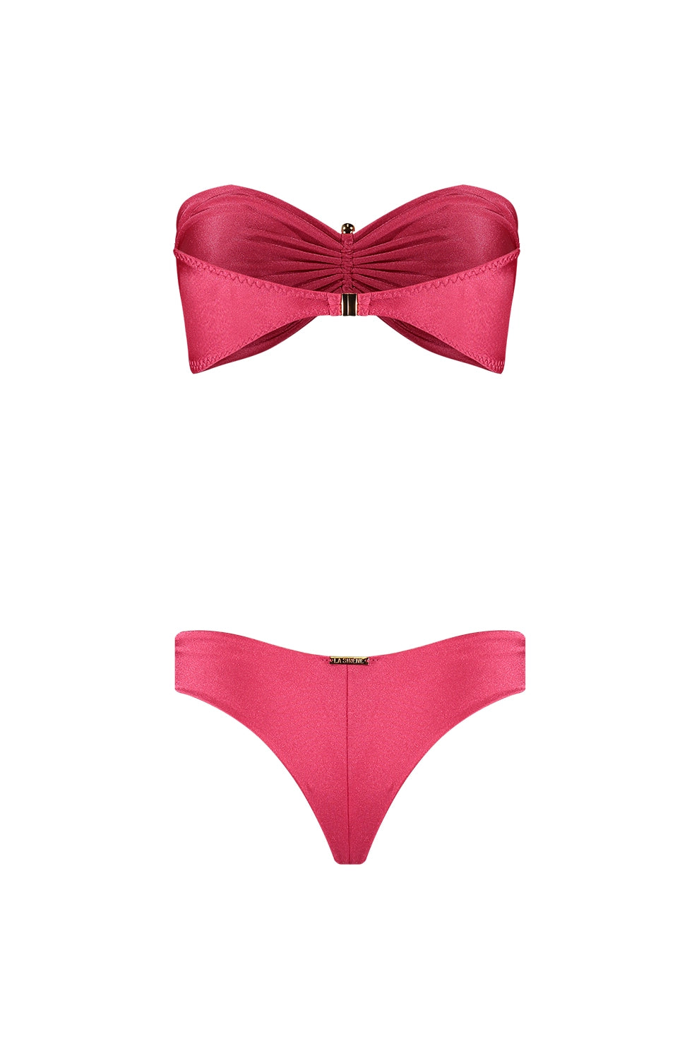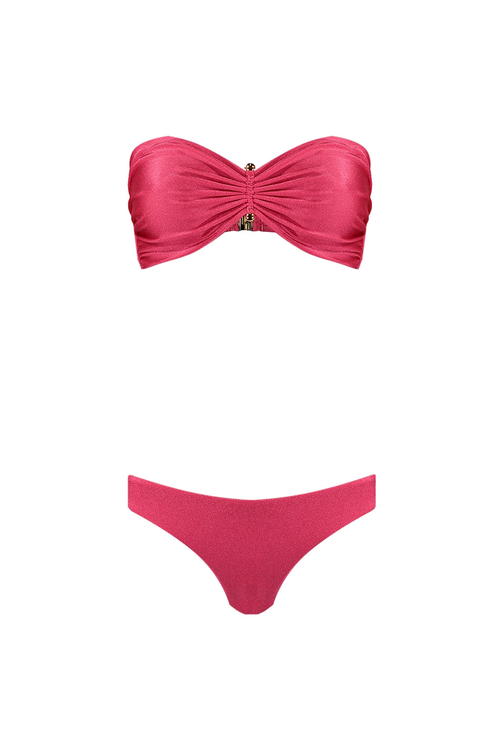 Biquíni modelo tomara que caia estruturado e recorte drapeado no centro, finalizado com um travete dourado.