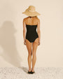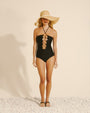 Body em lycra brilho com design elegante e toque sofisticado. O modelo possui decote profundo valorizado por anel central e cordão ajustável no pescoço, criando um visual moderno e feminino.