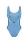 Maiô azul com leve brilho tem visual moderno e elegante. O modelo conta com decote redondo na frente e costas bem cavadas, que destacam a silhueta de forma sofisticada. O tecido tem toque macio, elasticidade e acabamento brilhoso, perfeito para usar na praia ou como body em produções urbanas.