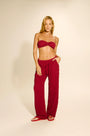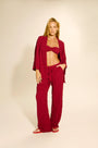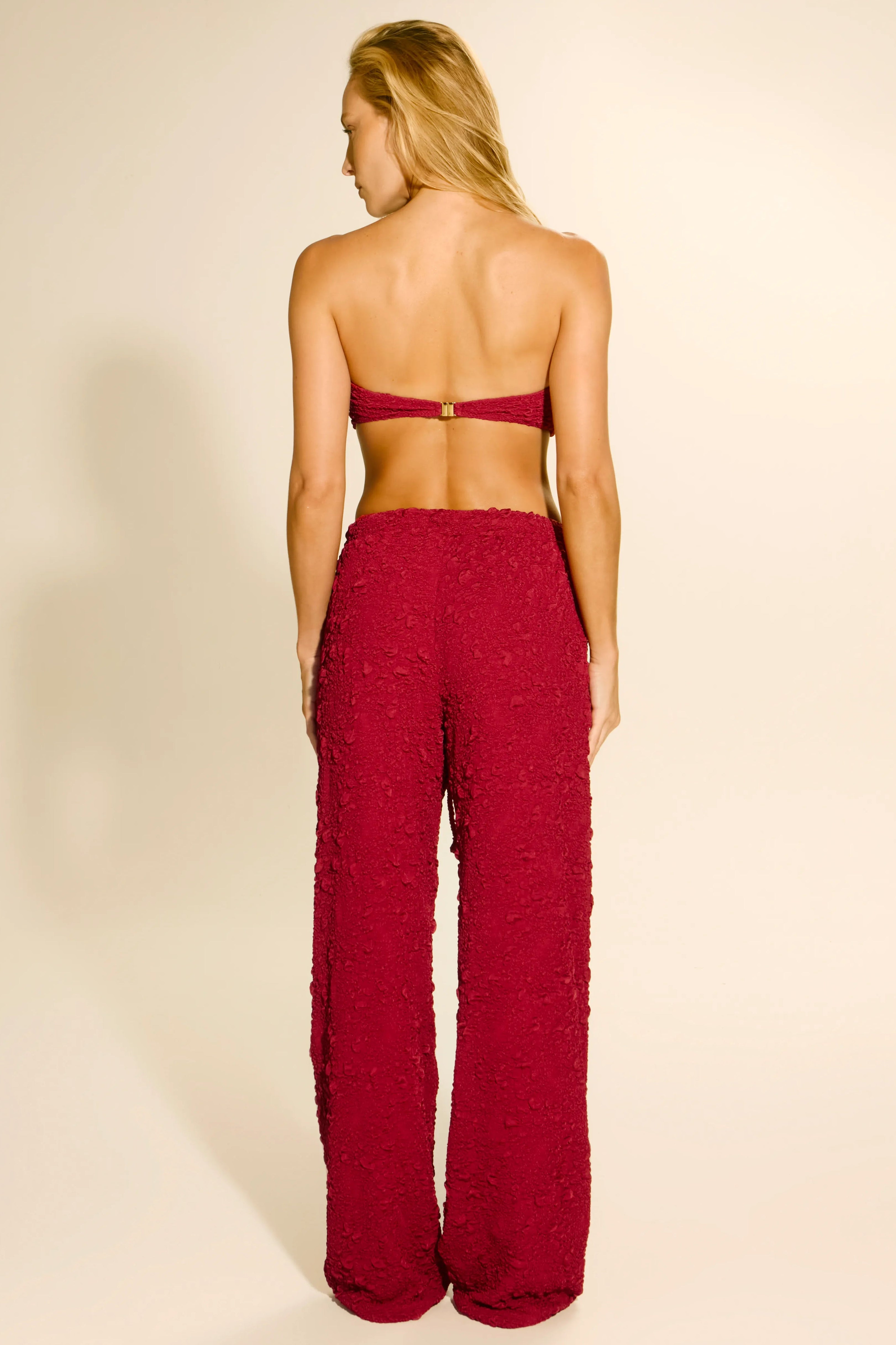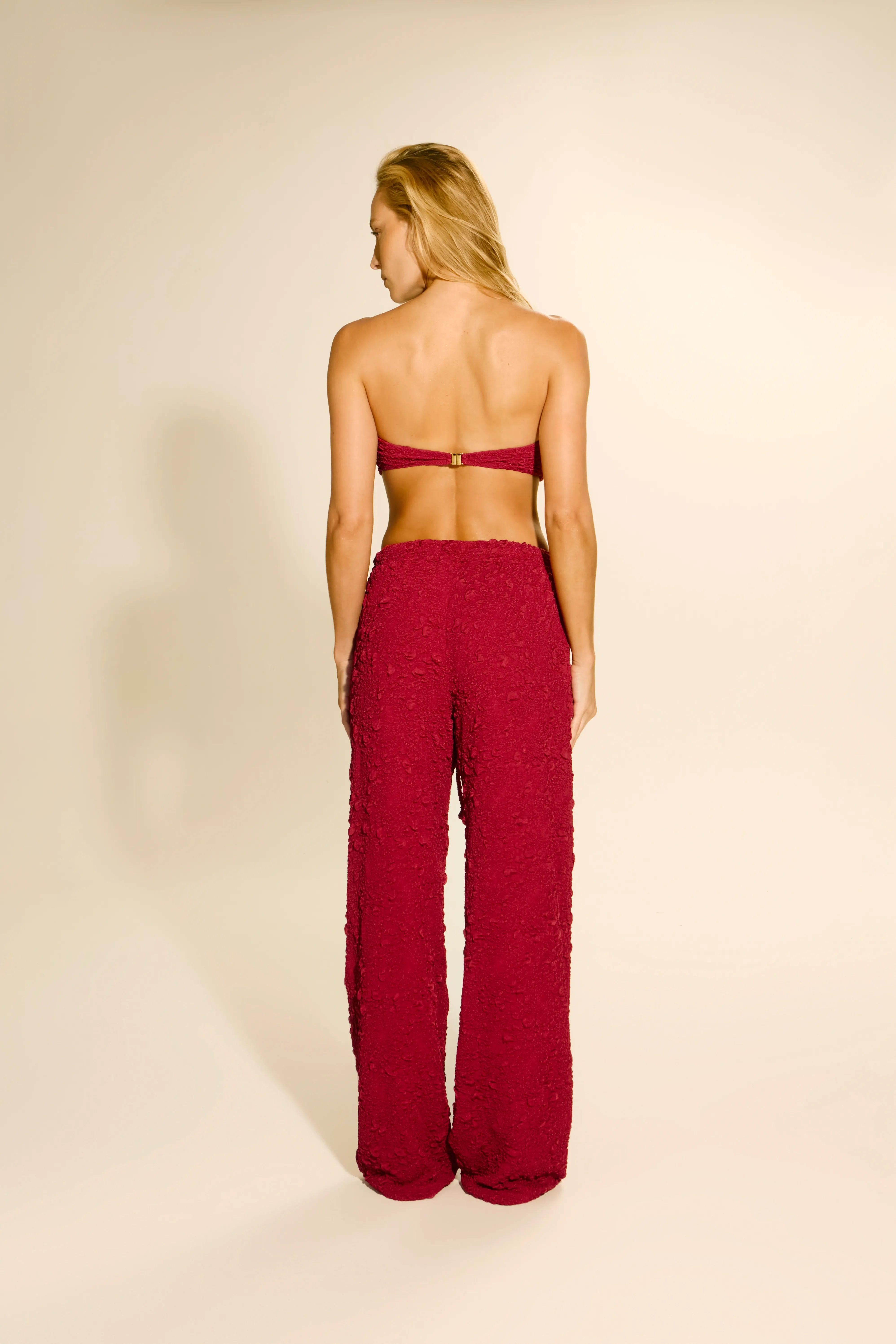 A calça apresenta modelagem reta com caimento solto, cós alto com ajuste por cordão e amarração frontal, além de bolsos laterais funcionais que garantem praticidade. O tecido encorpado com textura em relevo.