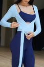 Seu design conta com amarração frontal, permitindo diferentes formas de uso — seja mais ajustado ao corpo ou de maneira solta e descontraída. As mangas longas equilibram o visual, adicionando sofisticação ao modelo. O tom marinho intenso reforça sua atemporalidade, perfeito para compor looks sofisticados tanto em treinos quanto em produções urbanas.