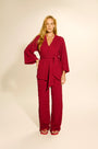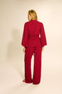 As mangas são longas e mais amplas, no estilo boca de sino, possui faixa do mesmo tecido para amarração na cintura, permitindo ajustar e valorizar a silhueta conforme o uso.