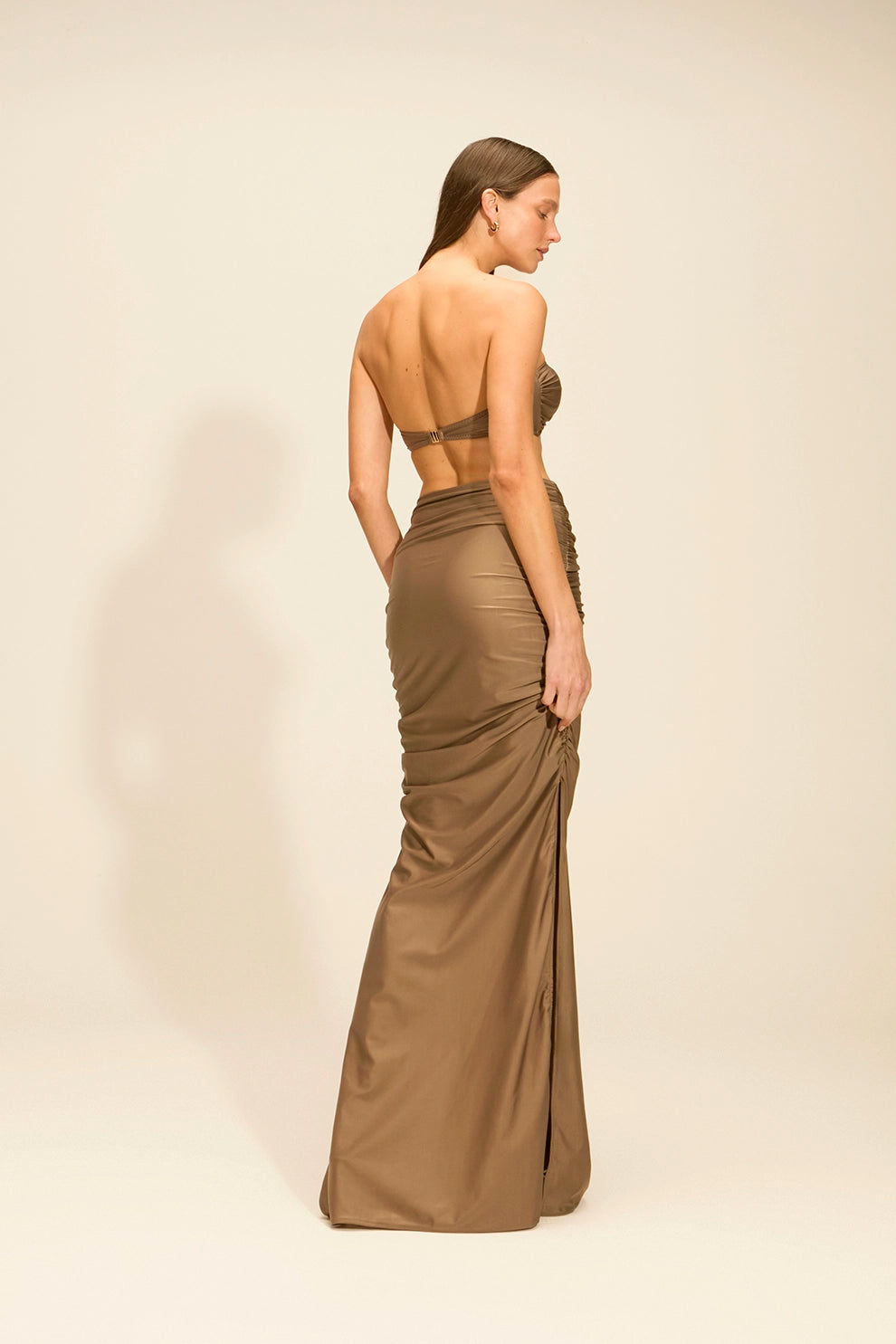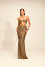 Saia longa com pala sobreposta no cós e aviamento central em metal. As fendas laterais trazem leveza e movimento, enquanto a modelagem valoriza o corpo com caimento fluido e confortável. Uma peça versátil, pensada para compor looks de praia a produções mais sofisticadas.