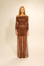 Saia longa em tule, desenvolvida com textura leve e transparência sutil que conferem movimento e sofisticação. A modelagem ajustada ao corpo destaca a silhueta, enquanto o comprimento fluido adiciona elegância e leveza à produção.