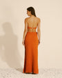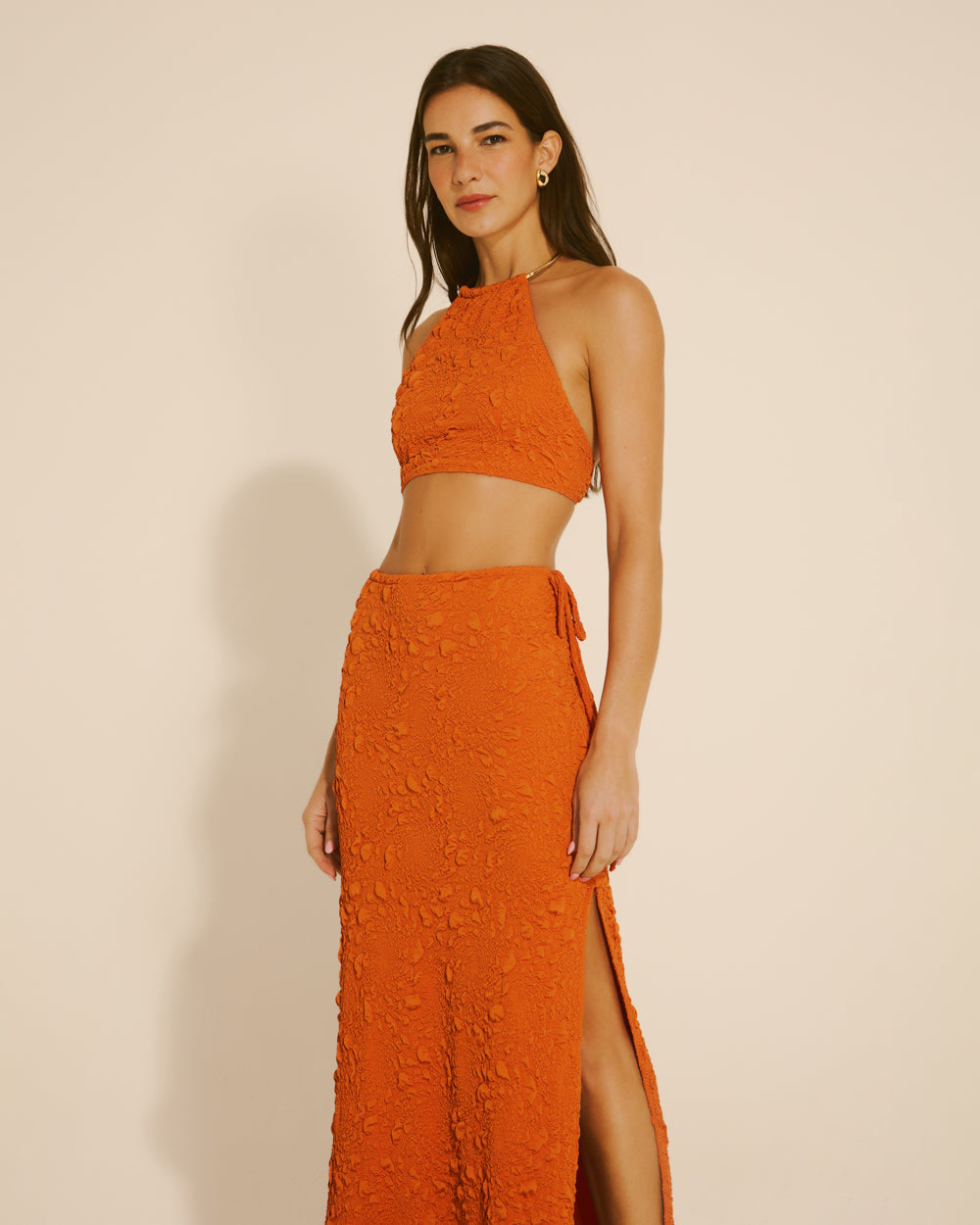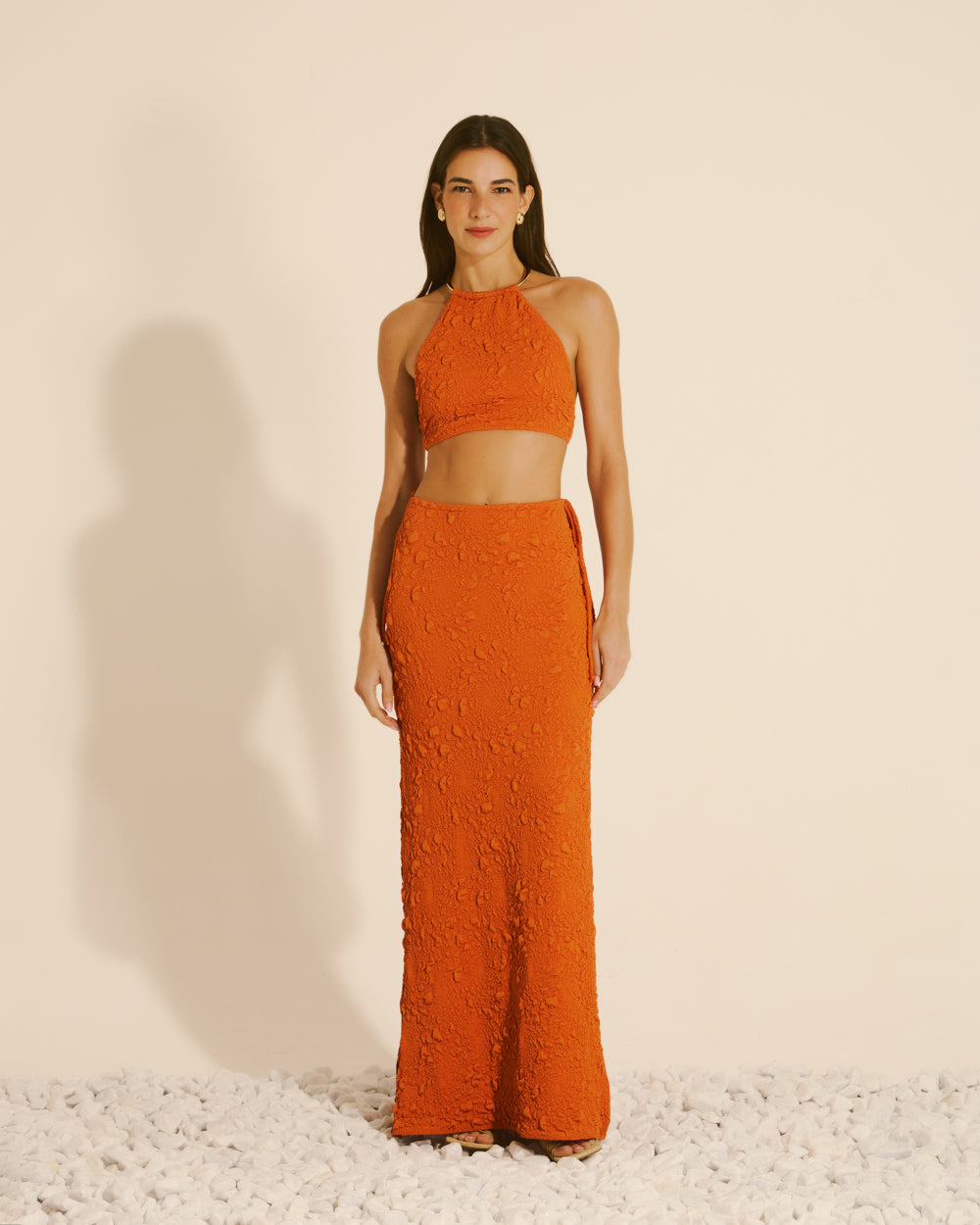 Conjunto de top com chocker dourada e saia longa com fendas laterais