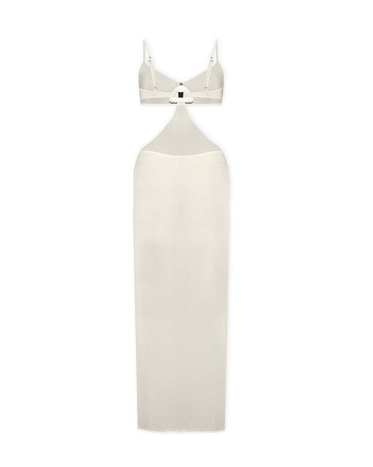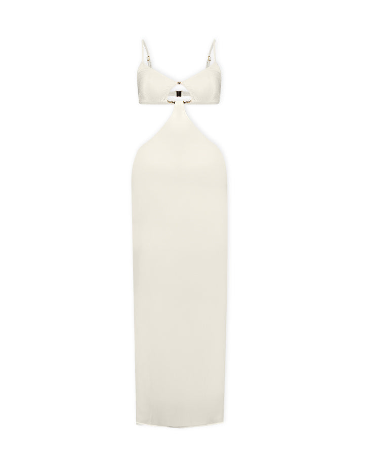 Com top estruturado e detalhe central com argola, esse modelo traz recortes estratégicos que valorizam a silhueta e criam um visual moderno e ousado. A saia longa reta equilibra o look, deixando tudo mais sofisticado.
