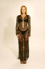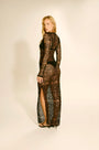 Vestido longo em tela com efeito furacão franja, que proporciona um visual elegante e moderno. Possui decote profundo valorizado por argolas douradas na parte frontal, manga longa e fendas laterais, que conferem movimento e sensualidade na medida certa.