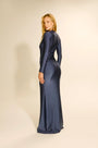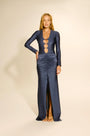 Vestido longo confeccionado em lycra brilho com decote em U profundo com três recortes finalizados com fechos em dourado. A região da cintura e do quadril possui franzido que ajuda assim como na parte da frente.
