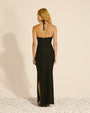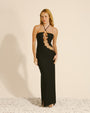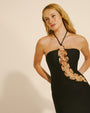 Vestido longo tomara que caia com modelagem ajustada ao corpo, valorizando a silhueta. O destaque fica por conta do detalhe frontal com argolas metálicas, que formam um desenho assimétrico sofisticado, além da amarração no pescoço, que garante sustentação e charme extra.
