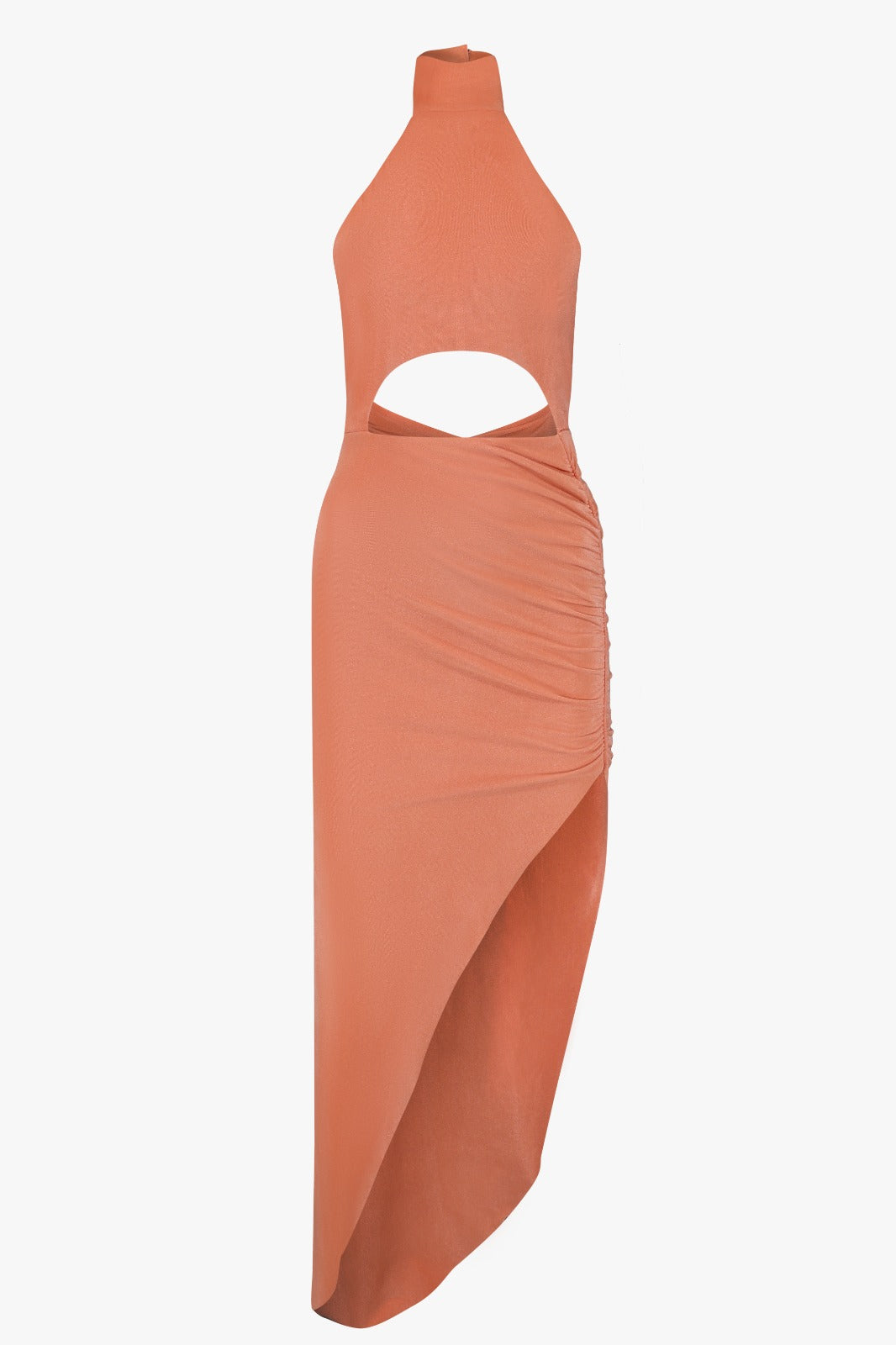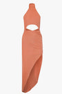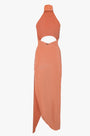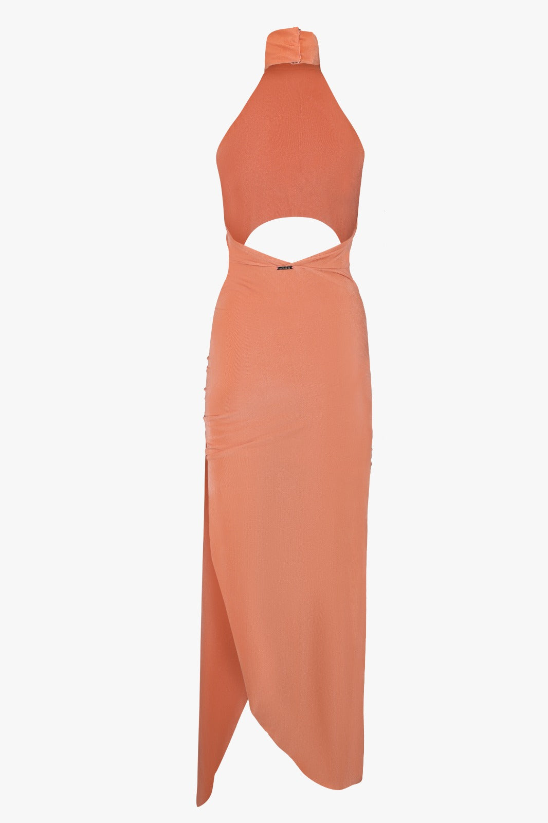 Vestido gola alta sem mangas, recorte frontal abaixo do busto, fenda e decote profundo nas costas