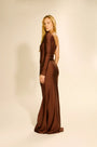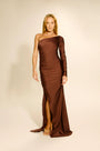 Vestido longo em lycra brilho com modelagem justa ao corpo, valorizando a silhueta de forma sofisticada.