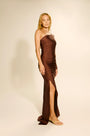 O vestido possui uma fenda frontal que traz leveza ao caminhar e um toque sensual ao visual.