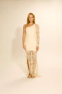 O design de um ombro só e a manga longa assimétrica criam um equilíbrio entre sensualidade e elegância, enquanto a transparência sutil revela a pele de forma delicada e moderna.