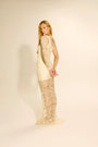 Vestido longo em tela, que une textura marcante e sofisticação minimalista.