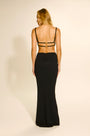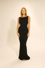 O tecido é encorpado, texturizado e com elasticidade, garantindo ajuste perfeito ao corpo sem perder o conforto. O comprimento chega até o chão, com leve sobra que cria movimento elegante ao andar.