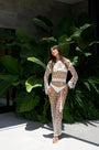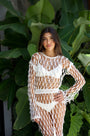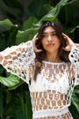 Vestido confeccionado artesanalmente em trama aberta no estilo rede, proporciona leveza e transparência, permitindo sobreposição com biquínis e maiôs.