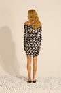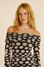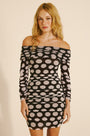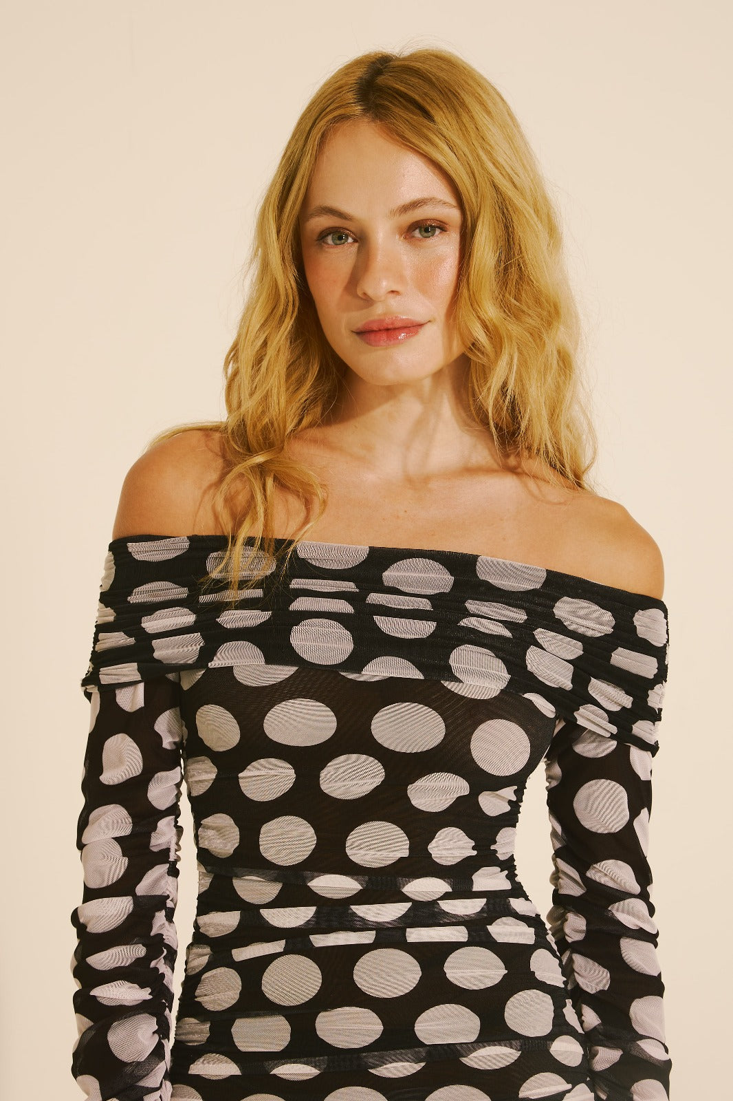 Vestido modelo ombro a ombro, drapeado, manga longa e franzido nas laterais.