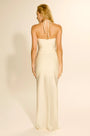 O modelo ajusta-se ao corpo com delicadeza, valorizando a silhueta e revelando a pele de forma sutil. O decote tomara que caia com amarração no pescoço equilibra o visual, tornando a peça perfeita para ocasiões especiais à beira-mar ou eventos noturnos.