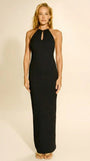 Modelagem reta, com detalhe no decote, pequeno recorte em gota é unido por um acessório metálico dourado. As alças seguem em amarração no pescoço, garantindo ajuste seguro e confortável.
