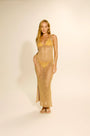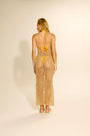 Vestido longo confeccionado em tricô artesanal de trama aberta, que proporciona leveza, frescor e transparência. Possui modelagem reta e alongada, com caimento fluido, decote em V na parte frontal alonga o colo, enquanto as alças largas garantem conforto e sustentação.