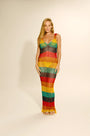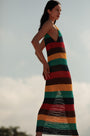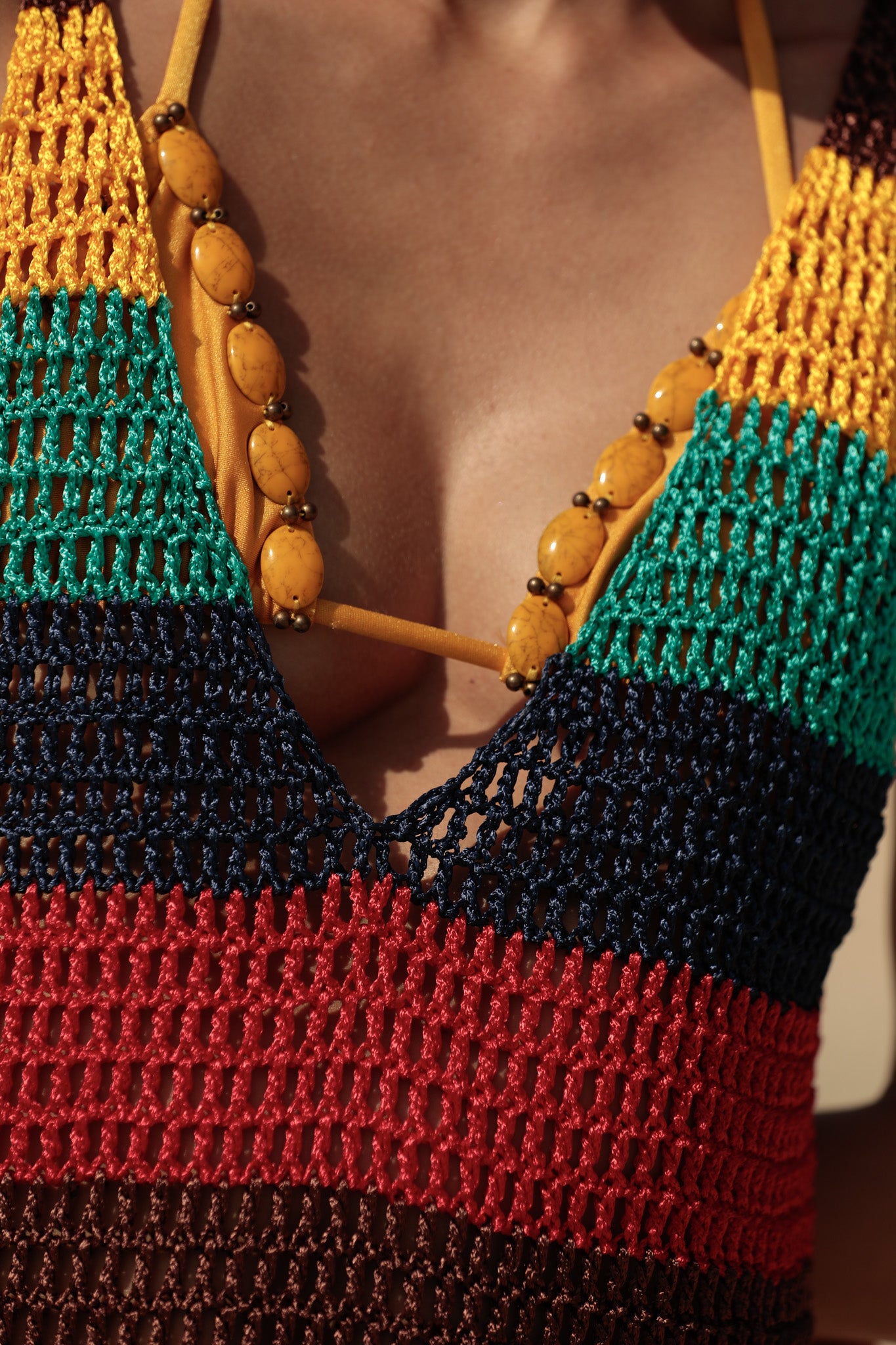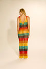 Vestido longo confeccionado em tricô artesanal de trama aberta, que proporciona leveza, frescor e transparência. Possui modelagem reta e alongada, com caimento fluido, decote em V na parte frontal alonga o colo, enquanto as alças largas garantem conforto e sustentação.