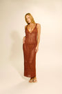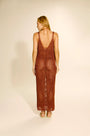 Vestido longo confeccionado em tricô artesanal de trama aberta, que proporciona leveza, frescor e transparência. Possui modelagem reta e alongada, com caimento fluido, decote em V na parte frontal alonga o colo, enquanto as alças largas garantem conforto e sustentação.