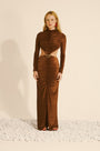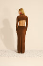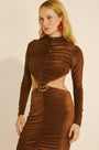 Com mangas longas e gola levemente alta, o design deste vestido evoca uma sensação de luxo discreto, perfeito para eventos formais e ocasiões especiais durante as estações mais frescas. A saia franzida adiciona movimento e suavidade ao look, conferindo uma silhueta feminina e ao mesmo tempo imponente. O fechamento em zíper nas costas garante praticidade e um ajuste perfeito, enquanto a abertura nas costas traz um toque de sensualidade sutil, sem perder a elegância. A tonalidade marrom, clássica e versátil, torna esse vestido uma escolha atemporal.