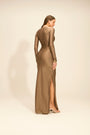 Vestido longo em malha fluida com leve brilho, que valoriza as curvas com elegância e modernidade. O modelo possui mangas longas e decote profundo em V com detalhe franzido central e aplicação delicada, criando um efeito sofisticado e feminino.