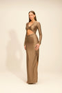 O grande destaque fica por conta do recorte estratégico na cintura, que contorna o corpo e traz um toque contemporâneo à peça. A saia longa tem caimento ajustado e fenda lateral discreta, garantindo movimento e sensualidade na medida certa.