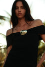 O Vestido Lótus Preto é uma peça atemporal com toque contemporâneo. O decote ombro a ombro valorizado pelo aviamento dourado traz brilho e sofisticação, enquanto o caimento rente ao corpo realça as curvas com elegância. Clássico e marcante, é perfeito para noites de verão, festas e ocasiões especiais.