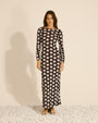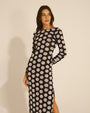 Vestido longo de tule com mangas longas, decote nas costas e duas fendas laterais